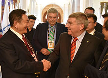 中国自行车运动协会主席崔大林向国际奥委会主席巴赫介绍 星空集团瑞豹自行车